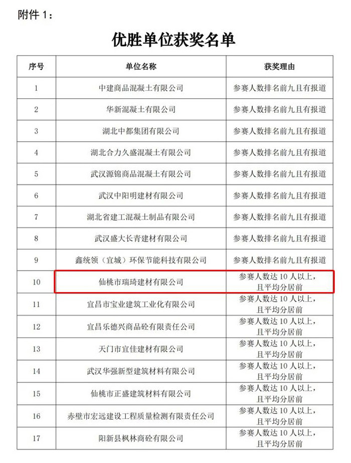 近日,根據(jù)湖北省預(yù)拌混凝土協(xié)會(huì)《關(guān)于公布“善諾律所杯”湖北省預(yù)拌混凝土(砂漿)企業(yè)質(zhì)量管理知識(shí)競(jìng)賽比賽結(jié)果的通知》,仙桃市瑞琦建材有限公司以優(yōu)異成績(jī)榮獲優(yōu)勝單位;黃果輝、嚴(yán)俊、付習(xí)文榮獲優(yōu)秀個(gè)人一等獎(jiǎng),許智勇、李弦榮獲優(yōu)秀個(gè)人二等獎(jiǎng)。...